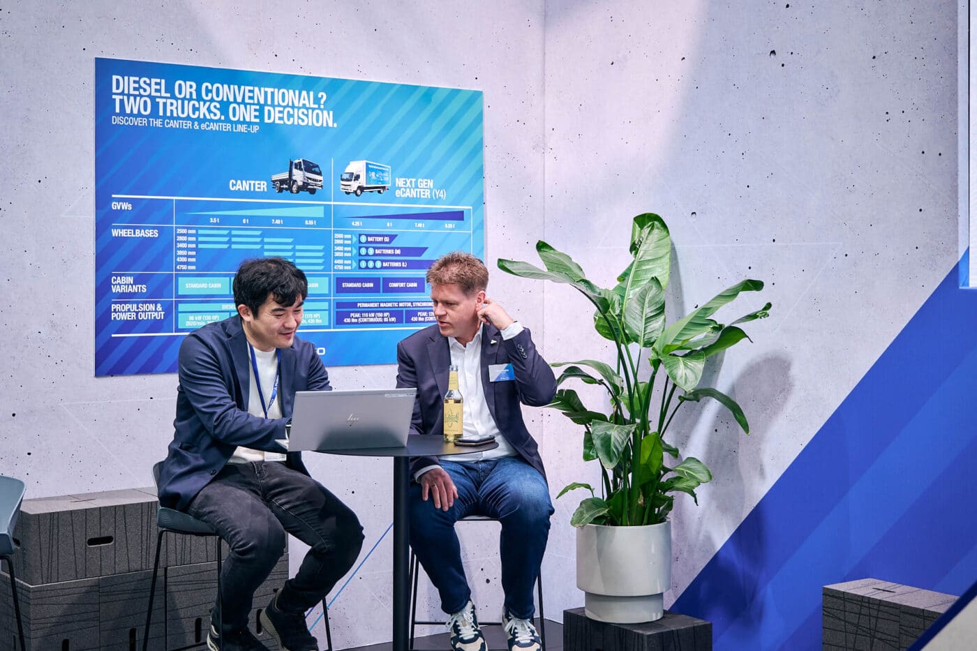 Hans kollega Manuel Baader säger: ”Folk frågar kanske först efter dieseln, men låter sig också gärna förklara vilka alternativ som finns”, beskriver han. Slutligen handlar de branscher som diskuteras om långsiktiga inköp och fokus ligger mer på köp än leasing, eftersom användningen är mycket intensiv. Dessutom investeras ofta mycket pengar i specialiserade påbyggnationer. Strategin att presentera den konventionella Cantern och eCanter sida vid sida är därför en självklarhet, menar produktchefen: ”Det är skönt att kunna visa, kära intressenter, att vi har den beprövade dieseln, men också en lika bred portfölj av framtidssäkra alternativ. Missionering sker dock inte hos oss. Vi levererar den information som kunden bestämmer.”